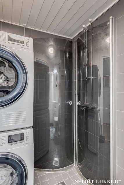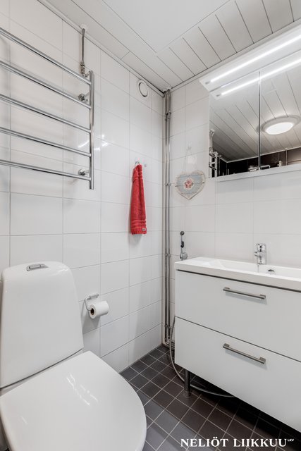 - WC-istuin, suihku, suihkukaappi, pesukoneliitäntä, peilikaappi, pesuallas, allaskaappi, ja bidee-suihku
