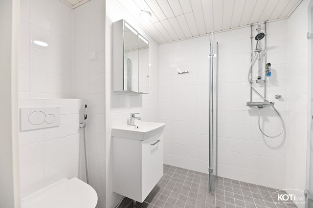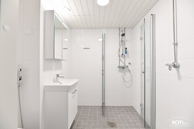- WC-istuin, suihku, lattialämmitys, pesukoneliitäntä, peilikaappi, ja suihkuseinä