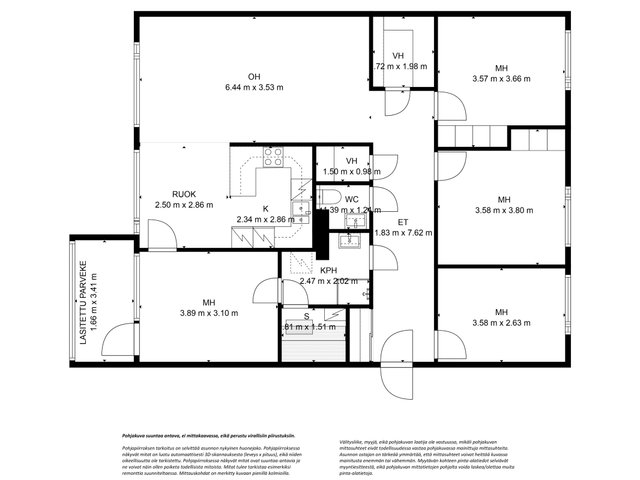 - Huoneiston pinta-ala on yhtiöjärjestyksen, isännöitsijäntodistuksen ja myyjän ilmoituksen mukaan 116,0 m2. Pinta-alaa ei ole tarkistusmitattu. Kohteen markkinoinnissa käytetään mittatiedoilla varustettua pohjapiirrosta. Pohjapiirroksen tarkoitus on helpottaa ostajan ostopäätöstä ja selvittää asunnon nykyinen huonejako. Välitysliike, myyjä tai pohjakuvan laatija eivät ole vastuussa, mikäli pohjakuvan mittasuhteet eivät todellisuudessa vastaa pohjakuvassa mainittuja mittasuhteita. Mittasuhteet voivat heittää kuvassa mainitusta enemmän tai vähemmän. Myytävän kohteen pinta-alatiedot selviävät myyntiesitteestä, eikä pohjakuvan mittatietojen pohjalta voida laskea/olettaa muita pinta-alatietoja.