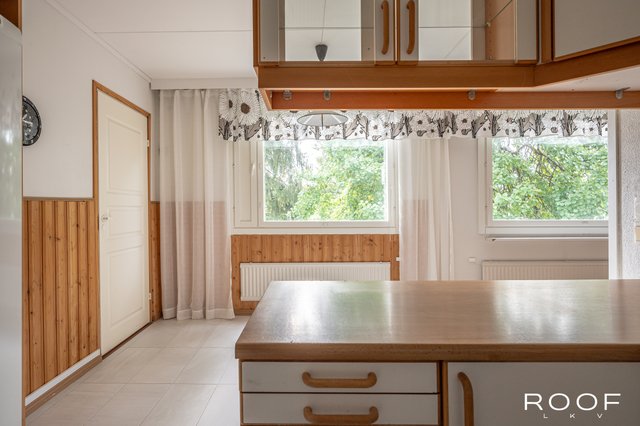 - 1990-luvulla uusittu keittiö, jonka koneistusta uusittu nykyisen omistajan toimesta. Tilaa ruokapöydälle. Näkymät taloyhtiön puistomaiselle piha-alueelle sekä Espoonlahden keskustan suuntaan. Metalli- ja laminaattitasot. Pinnat tapetoitu, lattia laatoitettu.