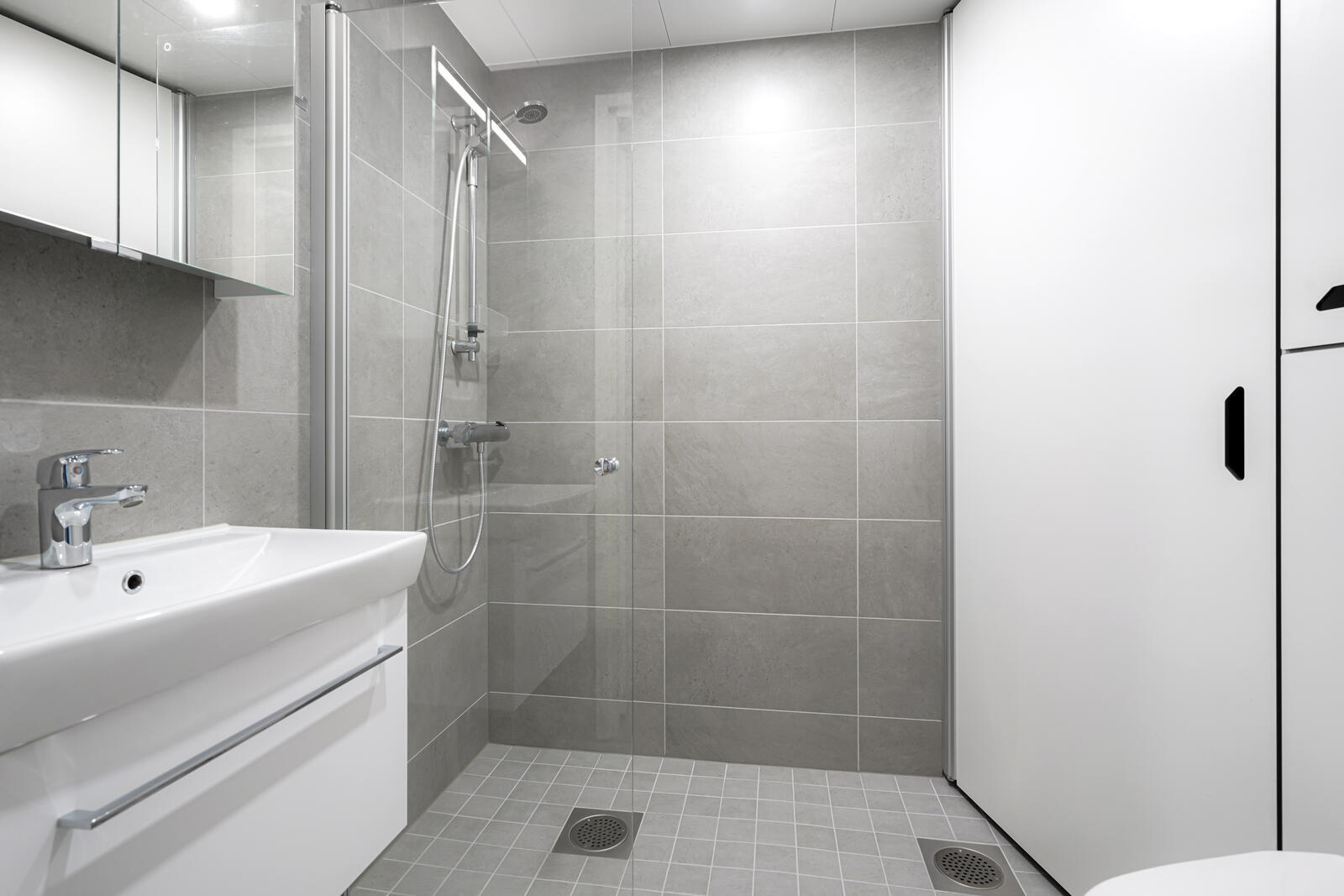 - Pesukoneliitäntä, lattialämmitys, suihkuseinä, peilikaappi, allaskaappi, suihku, wc-istuin, ja kiinteät valaisimet