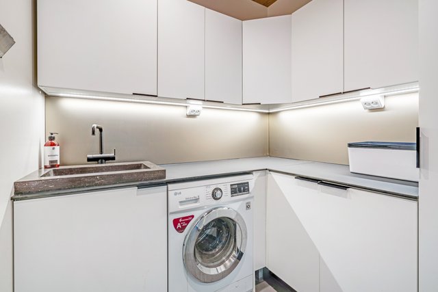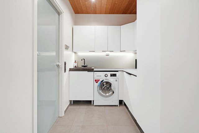 - Lattialämmitys, pyykkikaapit, pöytätaso, pesukoneliitäntä, ja pesuallas