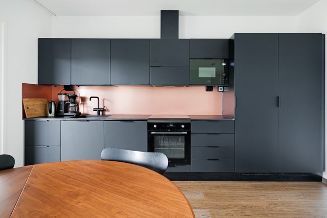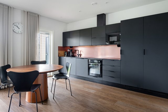 Moderni keittiö hurmaa tummilla kalusteillaan, integroiduilla kodinkoneilla ja kestävällä Dekton-tasolla. Kuparinen välitilan levy viimeistelee kokonaisuuden. Olohuone ja keittiö muodostavat valoisan ja avaran kokonaisuuden.