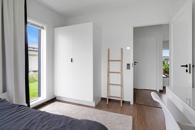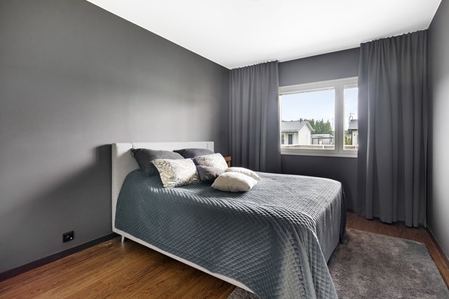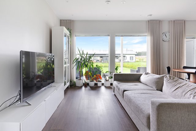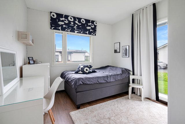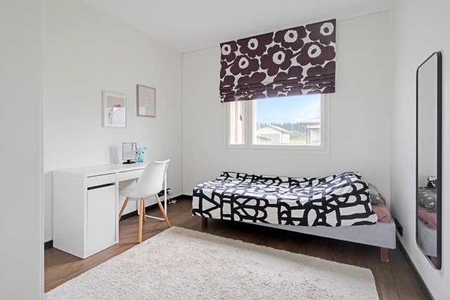 Tämän kodin pohjaratkaisu on toimiva: kahdessa makuuhuoneessa on kaapistot ja yhdessä tilava vaatehuone. Eteisessä lattia on tyylikästä laattaa, kun taas olohuoneessa, keittiössä ja makuuhuoneissa miellyttävän lämmin ja helppohoitoinen vinyylikorkkilattia.
