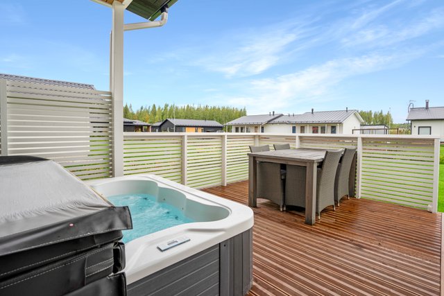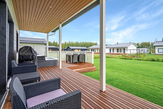 Pihapiiri on suunniteltu helppohoitoiseksi ja viihtyisäksi. Etupihan ajoväylä asfaltoitu. Autokatoksen yhteydessä on lämmin varasto. Tämän lisäksi takapihan terassin yhteydessä on kylmä varasto, joten säilytystilaa riittää. Takapihalla odottavat iso siirtonurmella toteutettu piha, tilava terassi sekä ulkoporeallas – täydellinen paikka rentoutumiseen ja viihtymiseen.