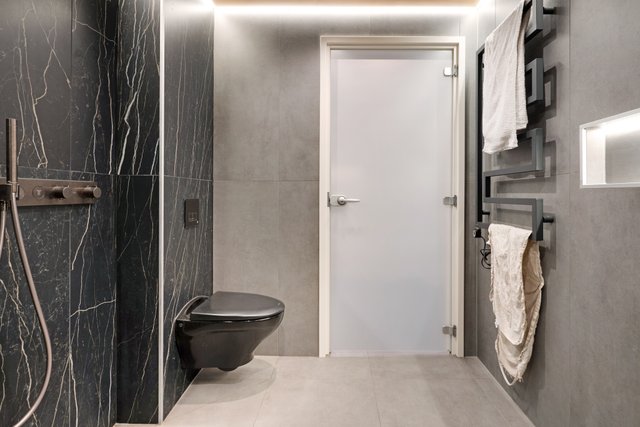 Kodinhoitohuoneesta on käynti spa-henkiseen kylpyhuoneeseen ja saunaan, jossa suuret laatat, tunnelmallinen valaistus ja sadesuihkut luovat rentouttavan ympäristön. Huoneistossa on kaksi wc:tä, joista toinen kylpyhuoneessa ja toinen erillisenä wc:nä eteisen yhteydessä.