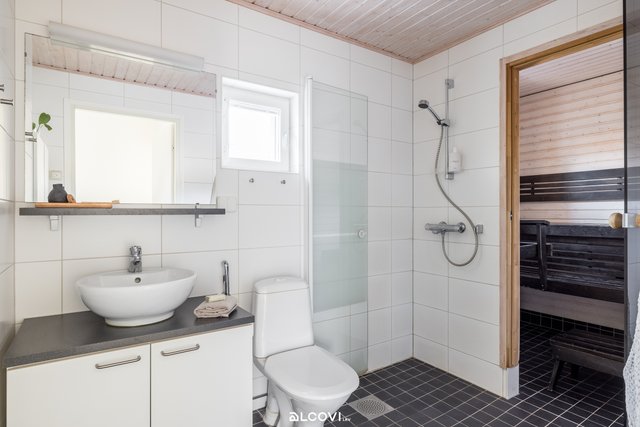 - Kylpyhuoneen varustukseen kuuluu allaskaappi, valaistu peili, seinäkaappi, suihku, lasinen kääntyvä suihkuseinä, wc-istuin, bidee-suihku ja pyyhekoukut. Lattia on laattaa, seinät kaakelia ja katto paneloitu. Lattialämmitys (sähkö).
