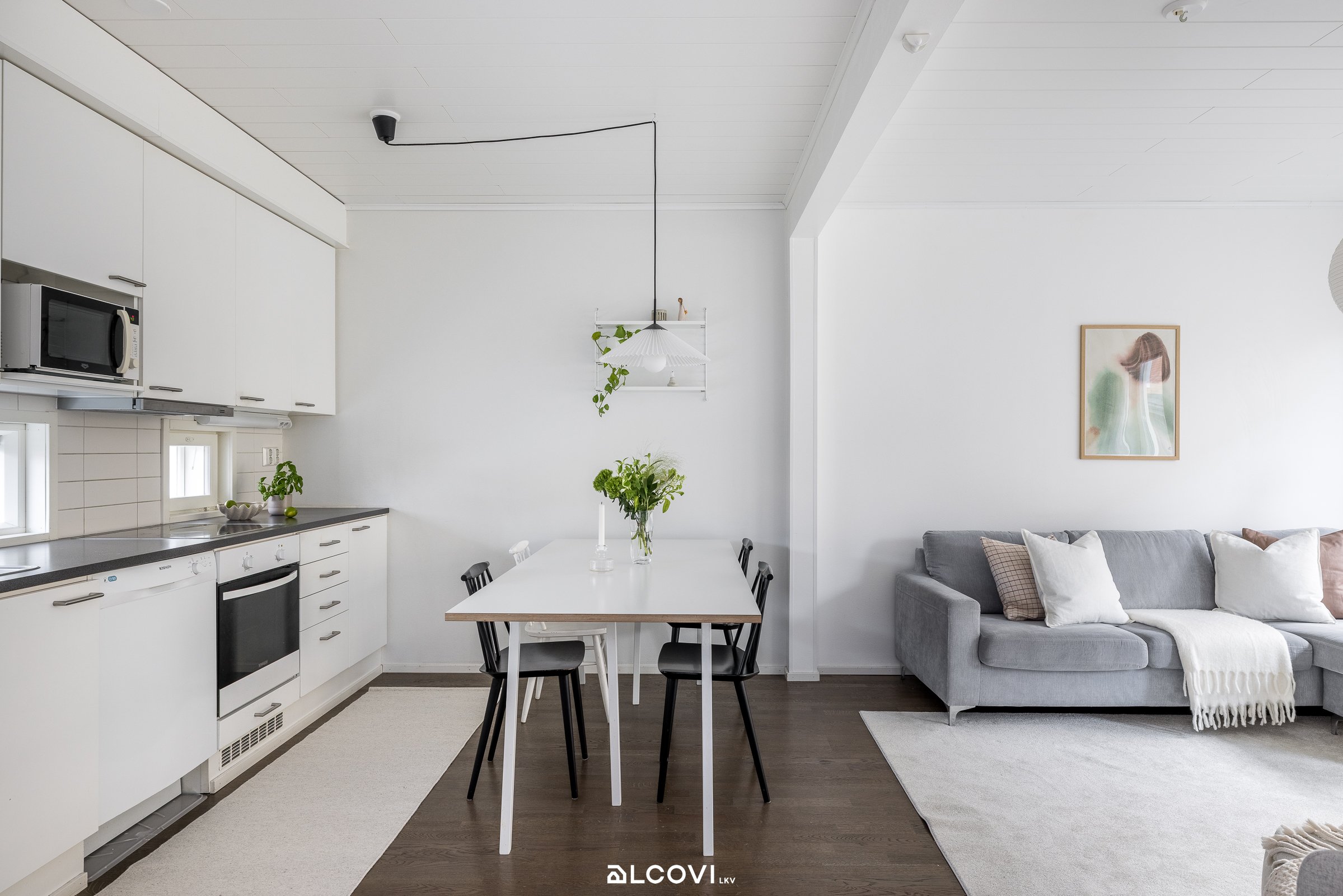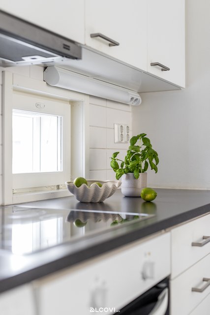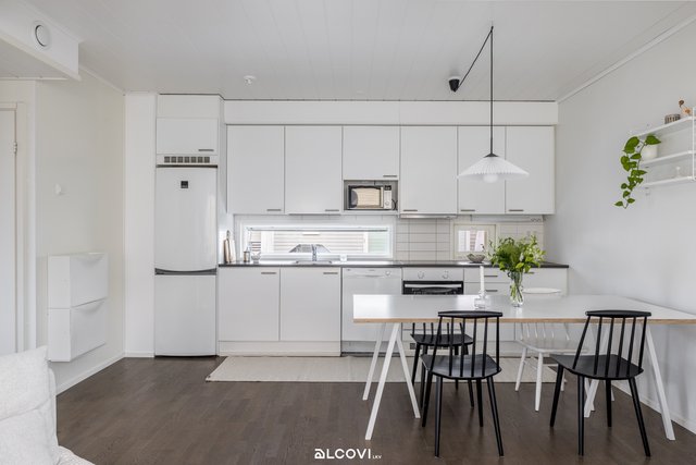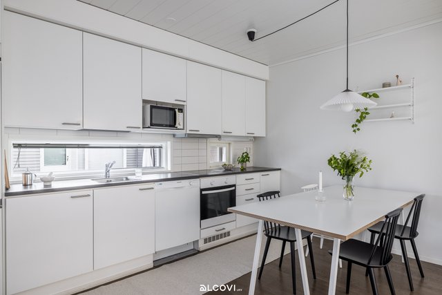 - Avokeittiön varustukseen kuuluvat keraaminen liesitaso, liesituuletin, astianpesukone, kalusteuuni, jääkaappi-pakastin ja tilavaraus mikroaaltouunille Työtaso on laminaattia, välitila kaakelia. Yläkaappien alla kiinteä valaistus. Lattia on tammiparkettia, seinät maalatut. Lattialämmitys (sähkö).
