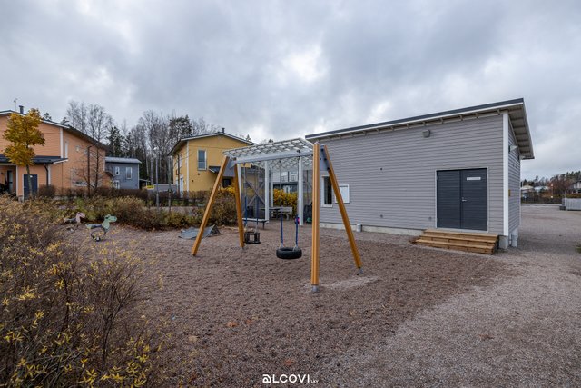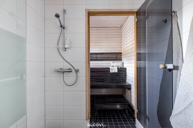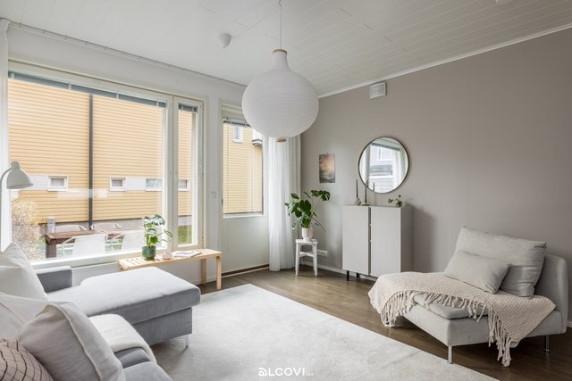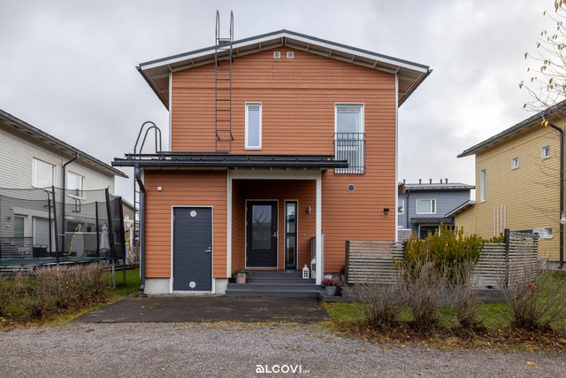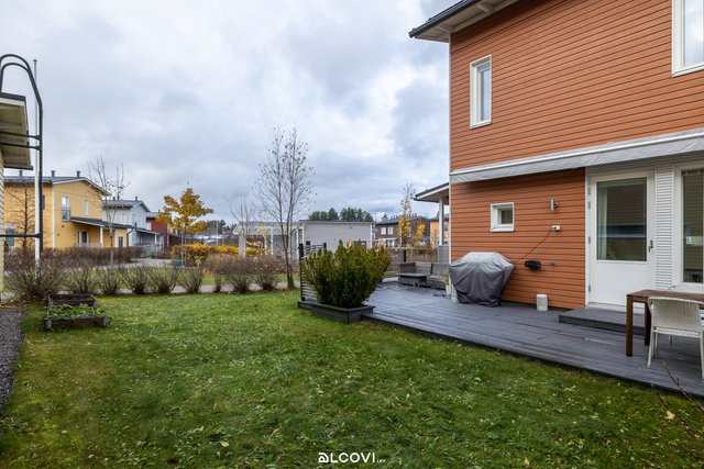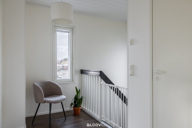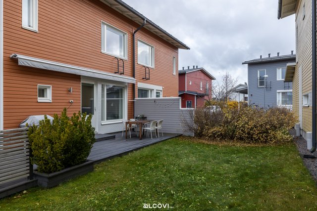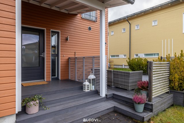 Raikas avokeittiö yhdistyy olohuoneen kanssa kutsuvaksi tilaksi, josta löytyy luonnollinen paikka arjen toiminnoille. Suurista ikkunoista luonnonvalo pääsee kauniisti osaksi sisustusta. Olohuone jatkuu tilavalle terassille, joka kutsuu nauttimaan kesäpäivistä. Suojaisa piha-alue tarjoaa paitsi terassin markiiseineen, myös tilaa lasten leikkeihin sekä istutuksille. Yläkerran rauhaan jäävät makuuhuoneet kiintokaapistoineen, sekä kylpyhuone ja sauna. Kylpyhuone on viimeistelty ajattomin materiaalein, ja sauna tarjoilee mainiot löylyt! Sisäänkäynnin yhteydessä sijaitsee sähköistetty autopaikka sekä ulkovarasto hyvine säilytystiloineen.