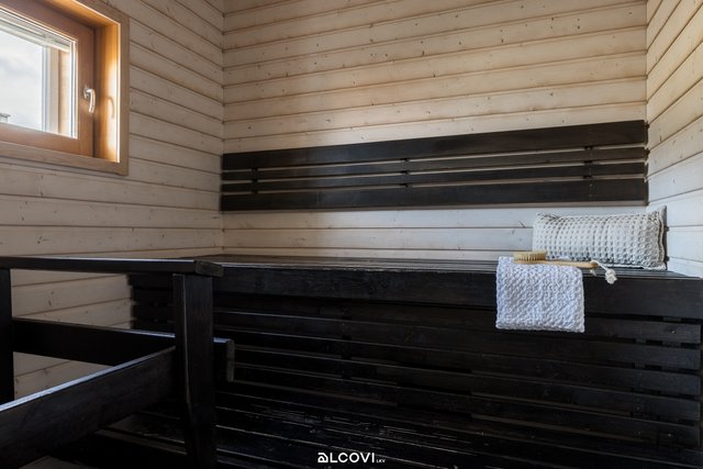 - Sähkökiuas. Saunan lattia on laattaa, seinät ja katto paneloitu. Ikkuna ulos.