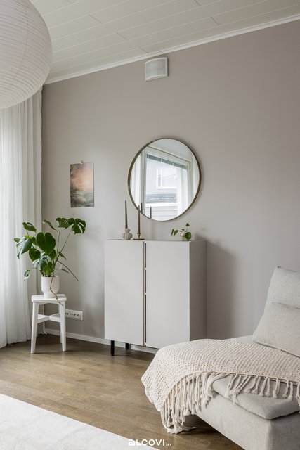 - Olohuoneen lattia on tammiparkettia, seinät maalatut. Lattialämmitys (sähkö). Kulku terassille.