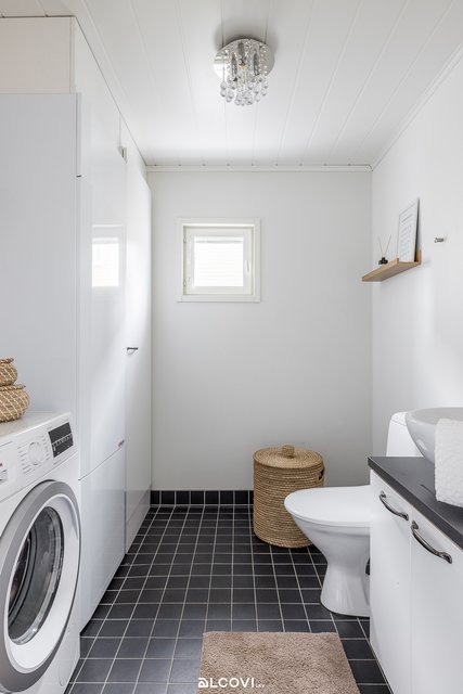 - Erillisen wc:n varustukseen kuuluu allaskaappi, peili, kaapistoa, pyykinpesukoneliitäntä, wc.istuin, bidee-suihku ja pyyhekoukut. Ikkuna ulos. Lattia on laattaa, seinät maalatut. Lattialämmitys (sähkö).