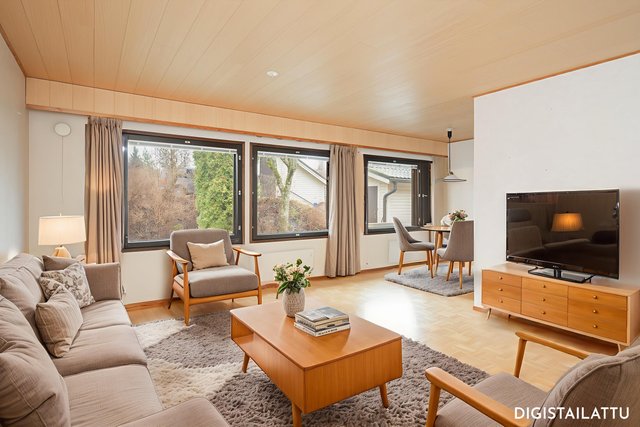 - Avara olohuone, missä on isot ikkunat ja näkymä vehreälle piha-alueelle.