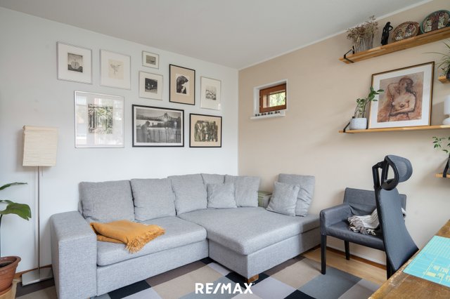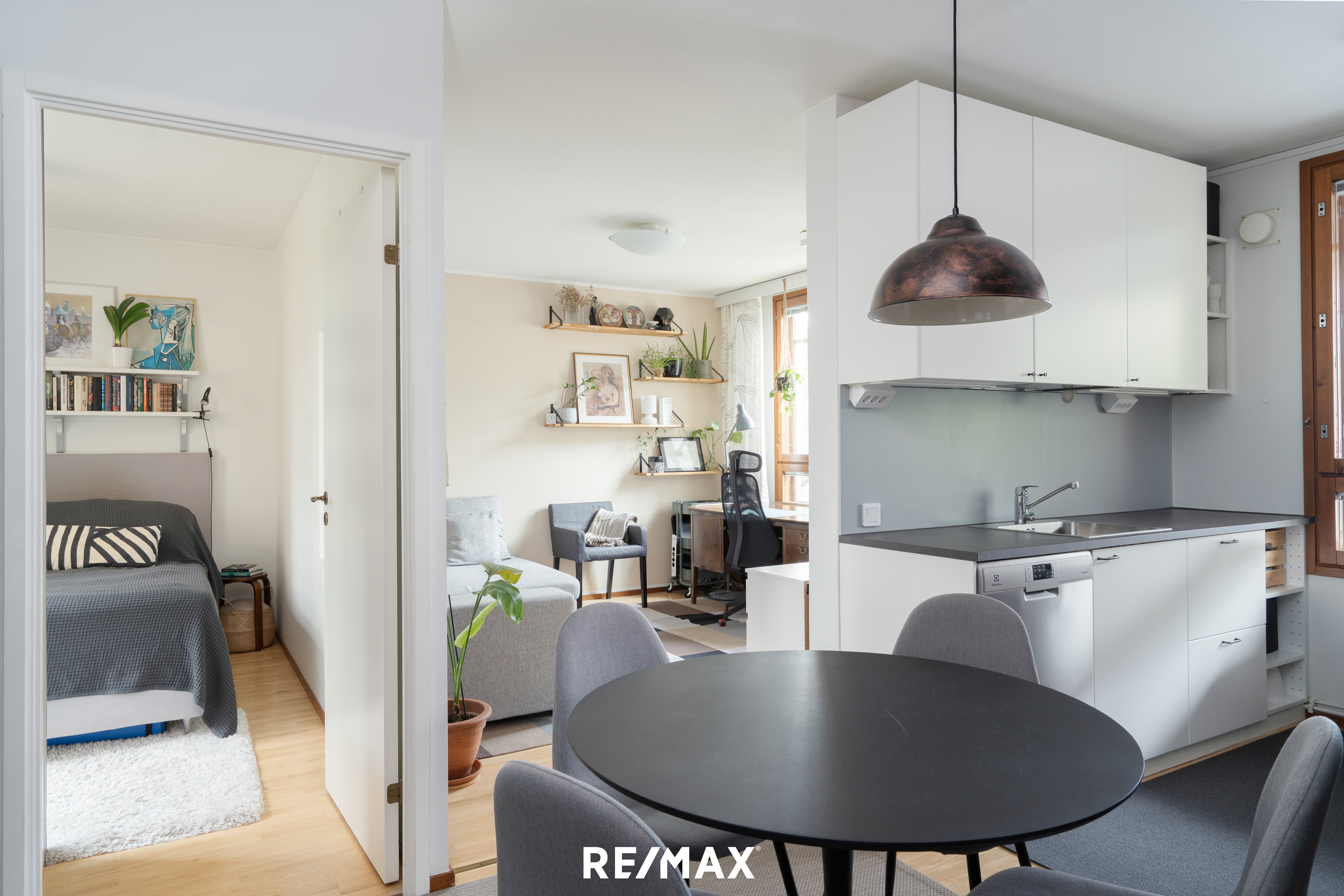 Asunnon avara olohuone ja toimiva keittiö yhdistyvät harmonisesti, luoden ihanteellisen ympäristön niin arkeen kuin yhdessäoloon. Makuuhuone tarjoaa rauhallisen tilan lepoon ja säilytysratkaisut pitävät arjen sujuvana.