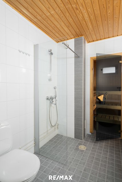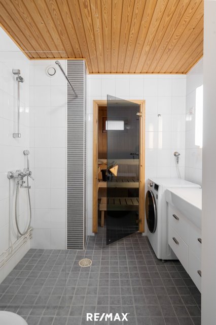 - WC-istuin, suihku, pesukoneliitäntä, peilikaappi, ja pesuallas