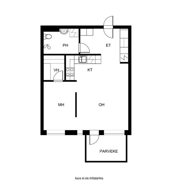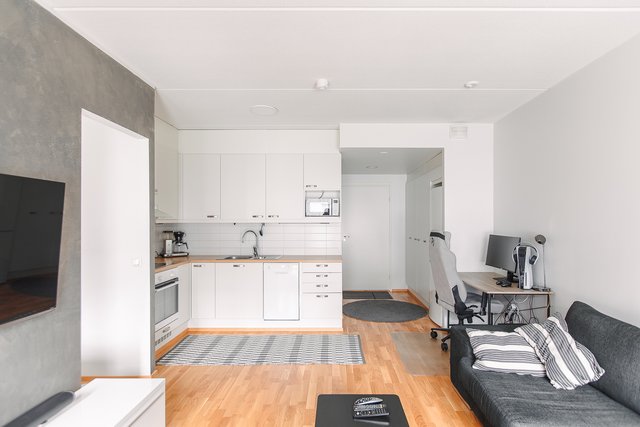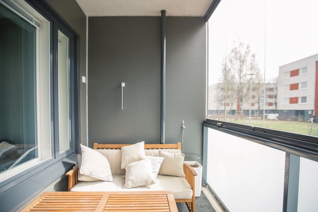 Asunnossa on kylpyhuone, avokeittiö, olohuone, lasitettu parveke ja makuuhuone. Makuuhuoneen yhteydessä on vaatehuone, joka tuo lisää säilytystilaa huoneistoon. Autopaikka myydään erikseen omalla osakesarjalla hintaan 3 900 €.