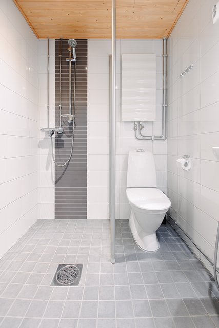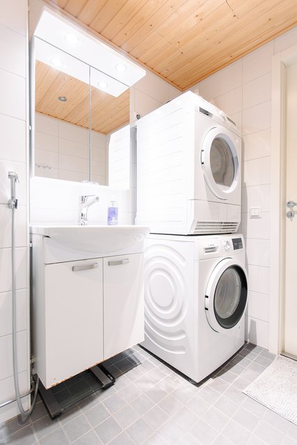 - WC-istuin, suihku, suihkuseinä, pesukoneliitäntä, allaskaappi, peilikaappi, ja lattialämmitys