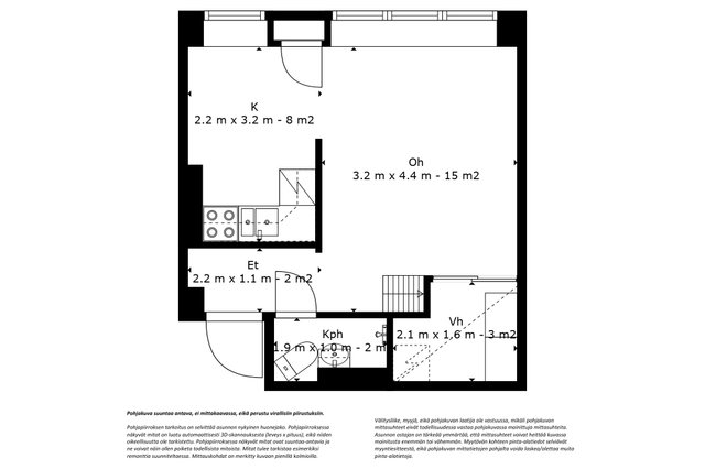 - Huoneiston pinta-ala on yhtiöjärjestyksen ja isännöitsijäntodistuksen mukaan 29 m². Pinta-alaa ei ole tarkistusmitattu. Edellä mainittu pinta-ala saattaa tämän ikäisessä kohteessa poiketa olennaisestikin huoneiston nykyisen ja rakentamisaikaisen mittaustapojen ja standardien mukaan laskettavasta pinta-alasta. Huoneiston todellinen pinta-ala voi siis olla yhtiöjärjestyksessä, isännöitsijäntodistuksessa ja esitteessä mainittua pienempi tai suurempi. Kohteen markkinoinnissa käytetään mittatiedoilla varustettua pohjapiirrosta. Lukija on tietoinen, että pohjakuva on suuntaa antava, ei mittakaavassa.
