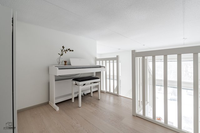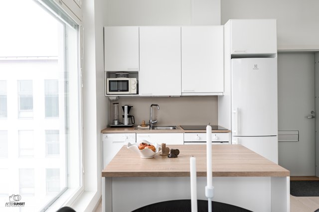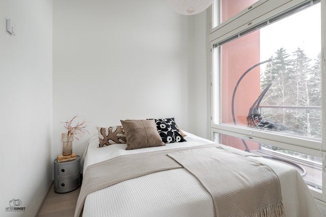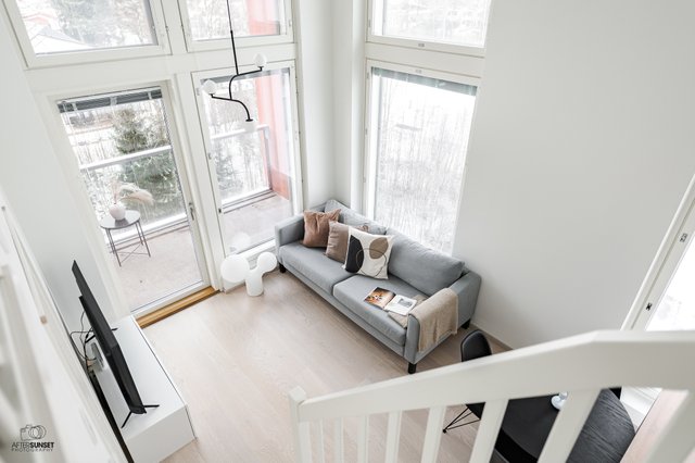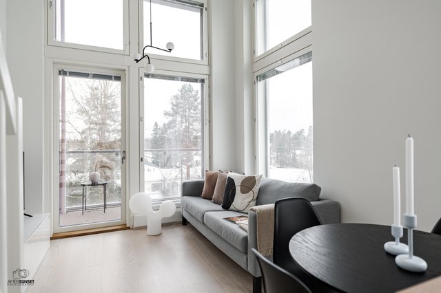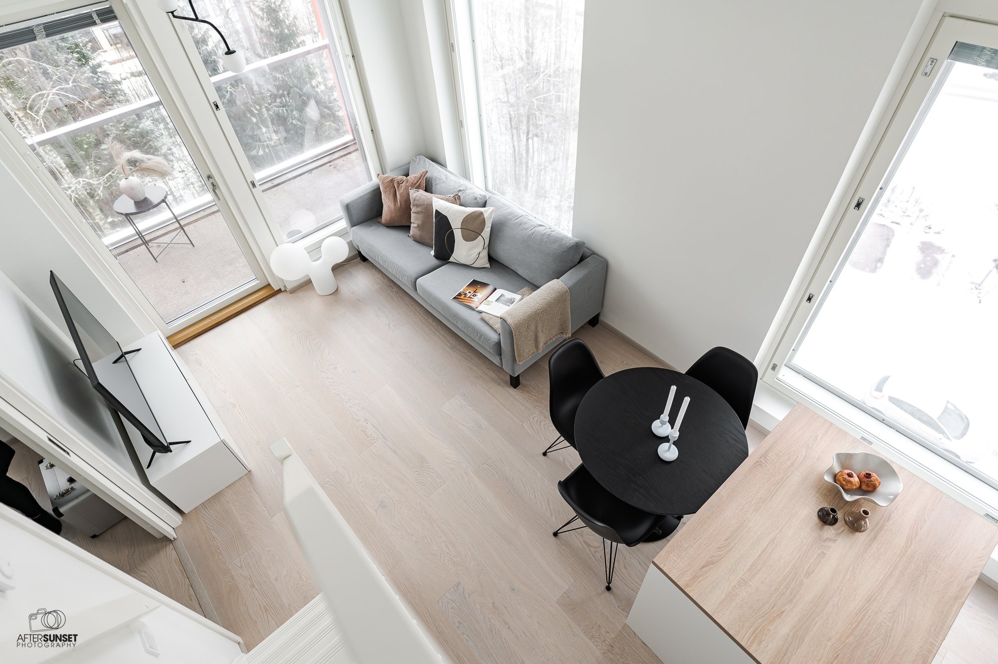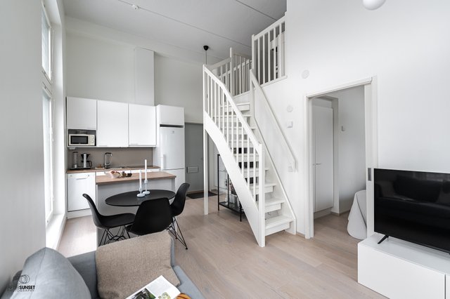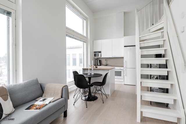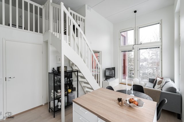 Todella suuri huonekorkeus ja kahteen ilmansuuntaan isot ikkunat antaa ripauksen luksusta kaksioon.