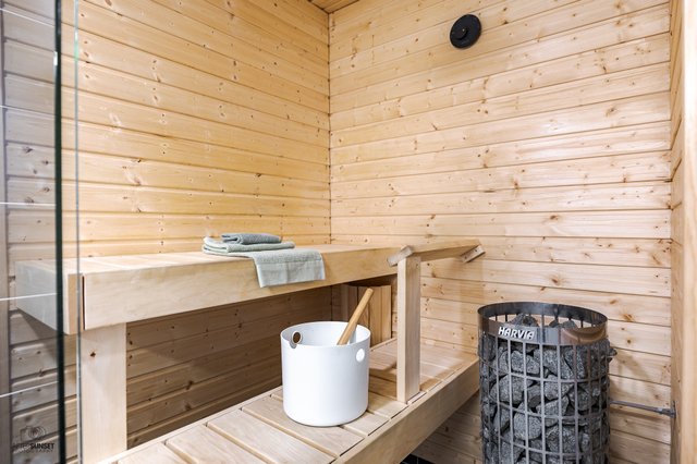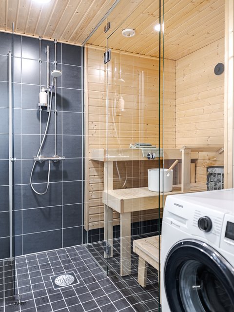 Kylpyhuoneen ja saunan välinen lasiseinä tuo avaruutta kompaktiin pikku kotiin.
