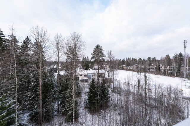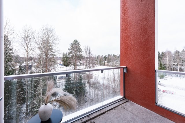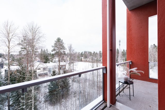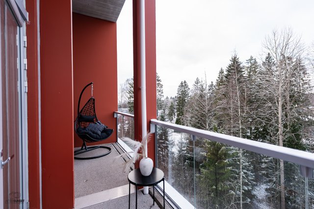Huoneiston leveydeltä parveketta metsän suuntaan ja ilta-aurinkoon.