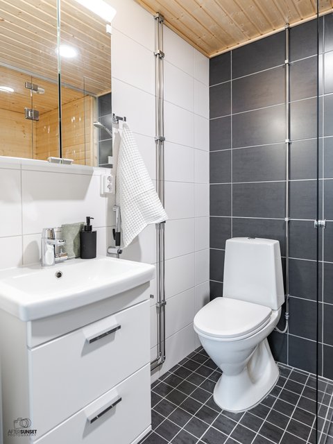 - WC-istuin, suihku, suihkuseinä, pesukoneliitäntä, bidee-suihku, allaskaappi, peilikaappi, ja pesuallas
