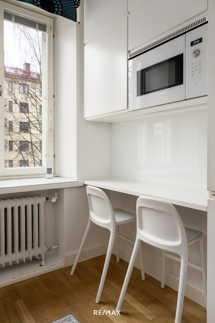 - Keittiössä Charmia kaapistot, integroitu jääkaappi/pakastinkaappi, induktioliesi (uusittu 2024 joulukuussa), erillisuuni (uusittu 2025 joulukuussa), liesituuletin, integroitu astianpesukone (uusittu kesällä 2024), integroitu mikroaaltouuni, lattia parkettia ja seinät lasikuitutapettia.