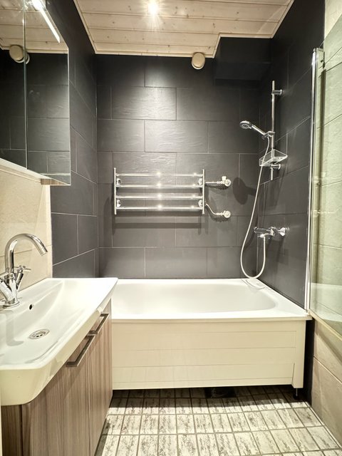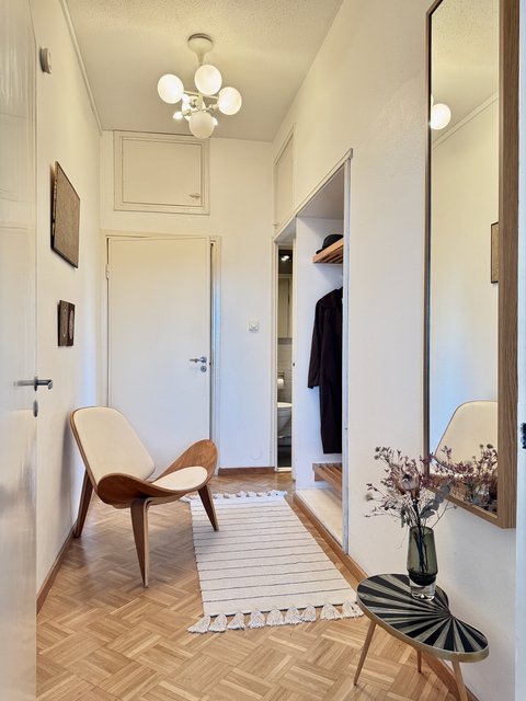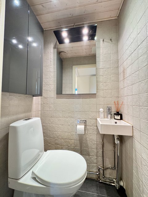 Lattioiden kaunis parketti tuo asuntoon lämpöä ja yhtenäisyyttä. Kylpyhuone ja wc ovat käytännöllisesti erikseen.