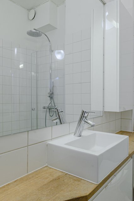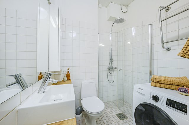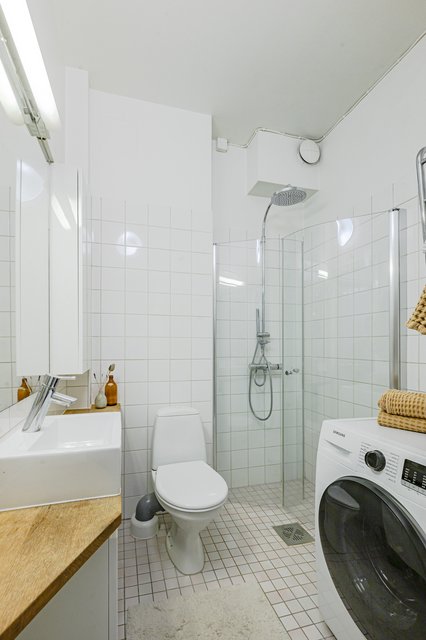 - Siisti, laatoitettu kylpyhuone, jossa varusteluna: Suihku, suihkunurkka kääntyvillä ovilla, pesukoneliitäntä, käsienpesuallas, allaskaappi, peili, wc-istuin.