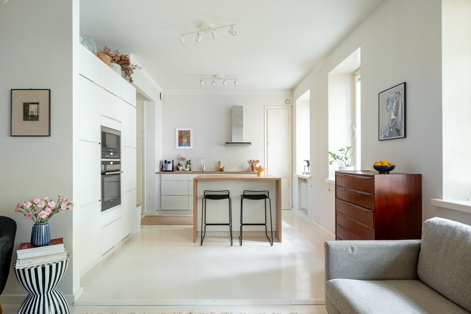 - Todella kaunis, harmoninen avokeittiö, jossa laadukas integroitu varustelu: Jääkaappi/pakastin, astianpesukone, liesi, uuni, mikroaaltouuni.