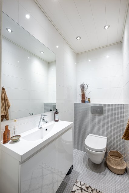 - Tyylikäs erillis-wc, jossa varusteluna: peili, käsienpesuallas, allaskaappi, wc-istuin.