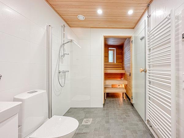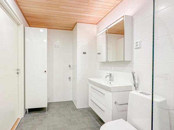 - WC-istuin, suihku, suihkuseinä, pesukoneliitäntä, lattialämmitys, peili, pesuallas, allaskaappi, ja bidee-suihku