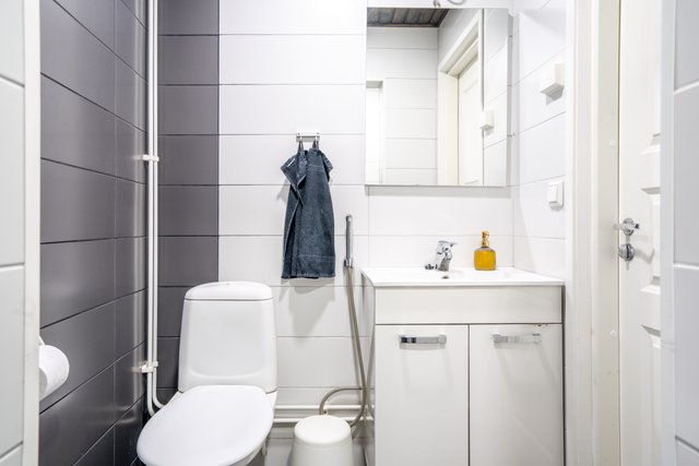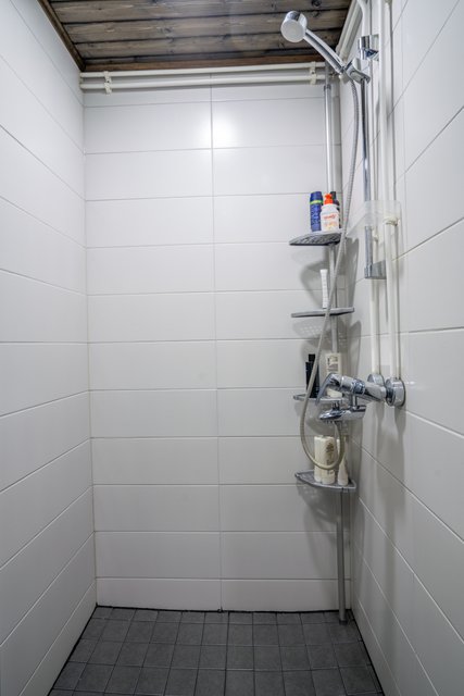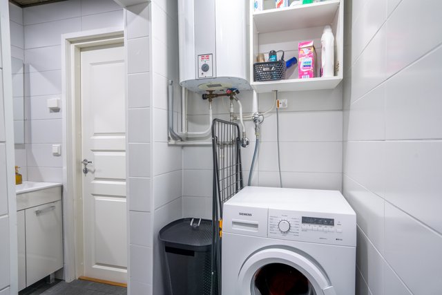 - WC-istuin, suihku, pesukoneliitäntä, lattialämmitys, pesuallas, allaskaappi, bidee-suihku, ja peilikaappi