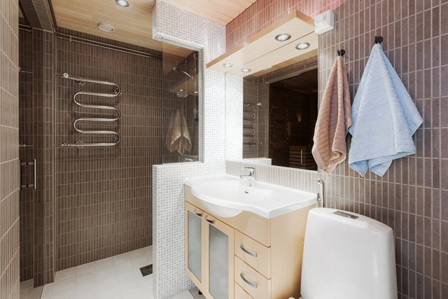 - WC-istuin, suihku, bidee-suihku, pesukoneliitäntä, suihkuseinä, ja peilikaappi