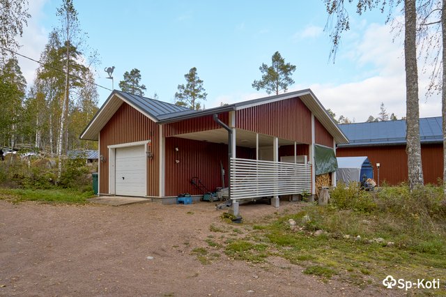 - Lämmin talousrakennus 67m2, rakennettu vuonna 2006, käsittäen autotallin, jossa sähköinen nosto-ovi, autokatos ja varasto.