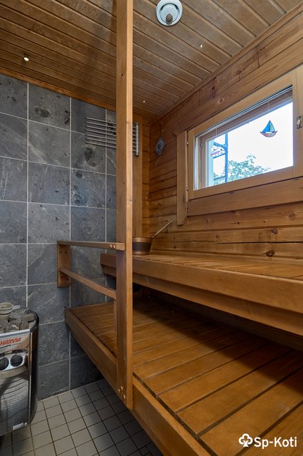 - Tunnelmallinen, ikkunallinen sauna. Tehosteseinä kiveä, kuituvalot saunan katossa.