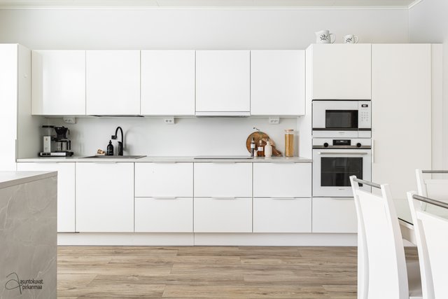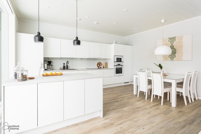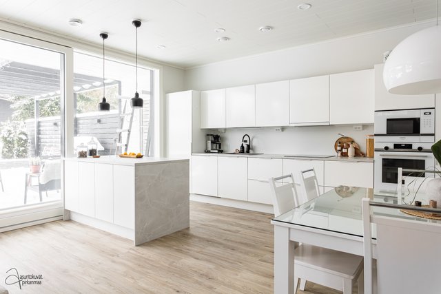 - Kaunis Puustellin valoisa keittiö. Lisätty niemeke (Keittiömaailma). Kodinkoneet Siemens.