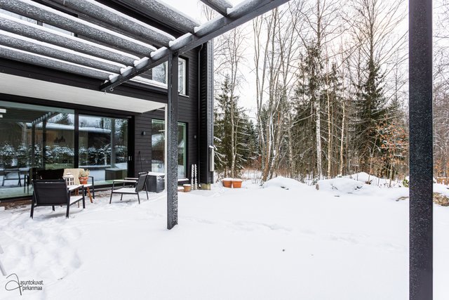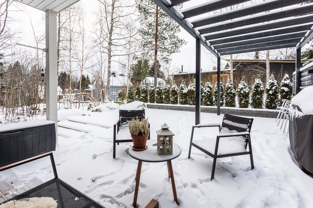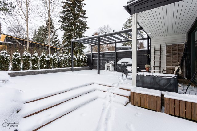 - Piha kokonaisuudessaan terassia, Etupiha kivetty. Kiva Pergola takapihalla. Istutettu tuijia tontin takaosaan.