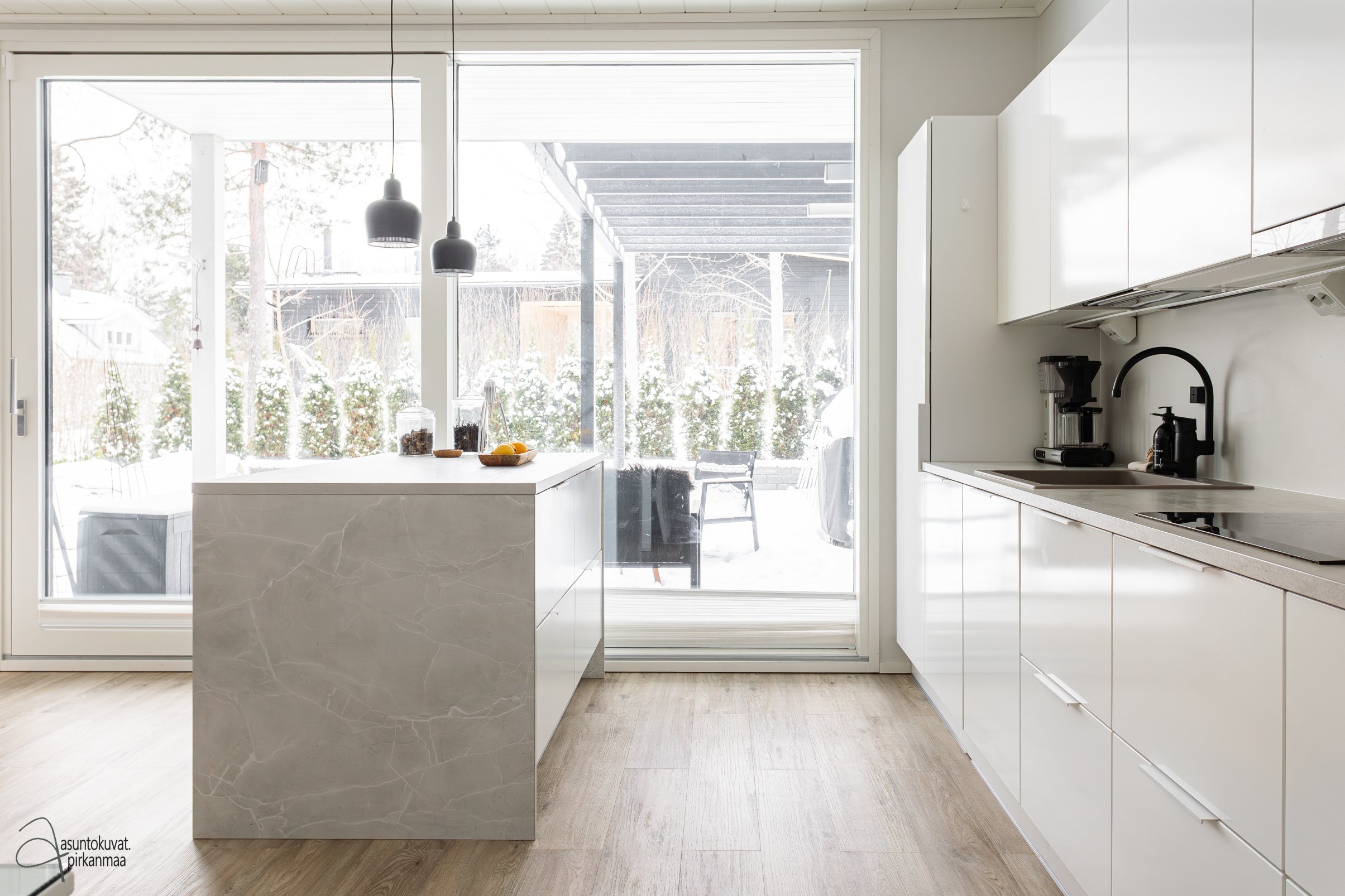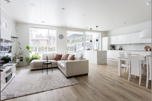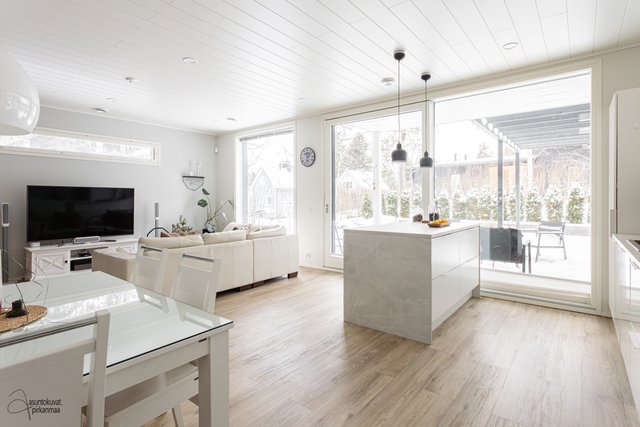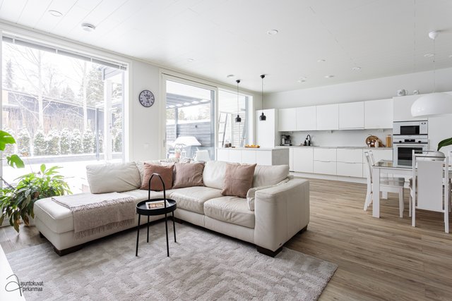 - Tilava olohuone yhdistyy keittiöön. Upea iso lasiliukuovi terassille avaa kesäaikaan jatkumon kodille.