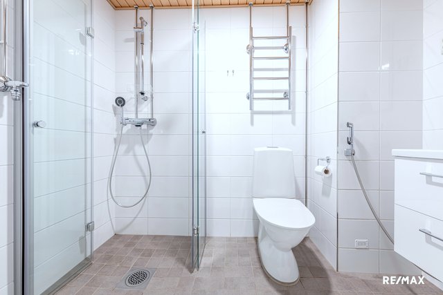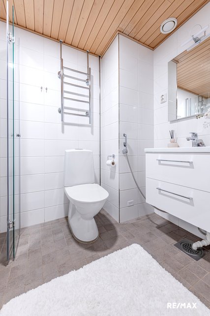 - WC-istuin, suihku, pesukoneliitäntä, peilikaappi, pesuallas, ja bidee-suihku