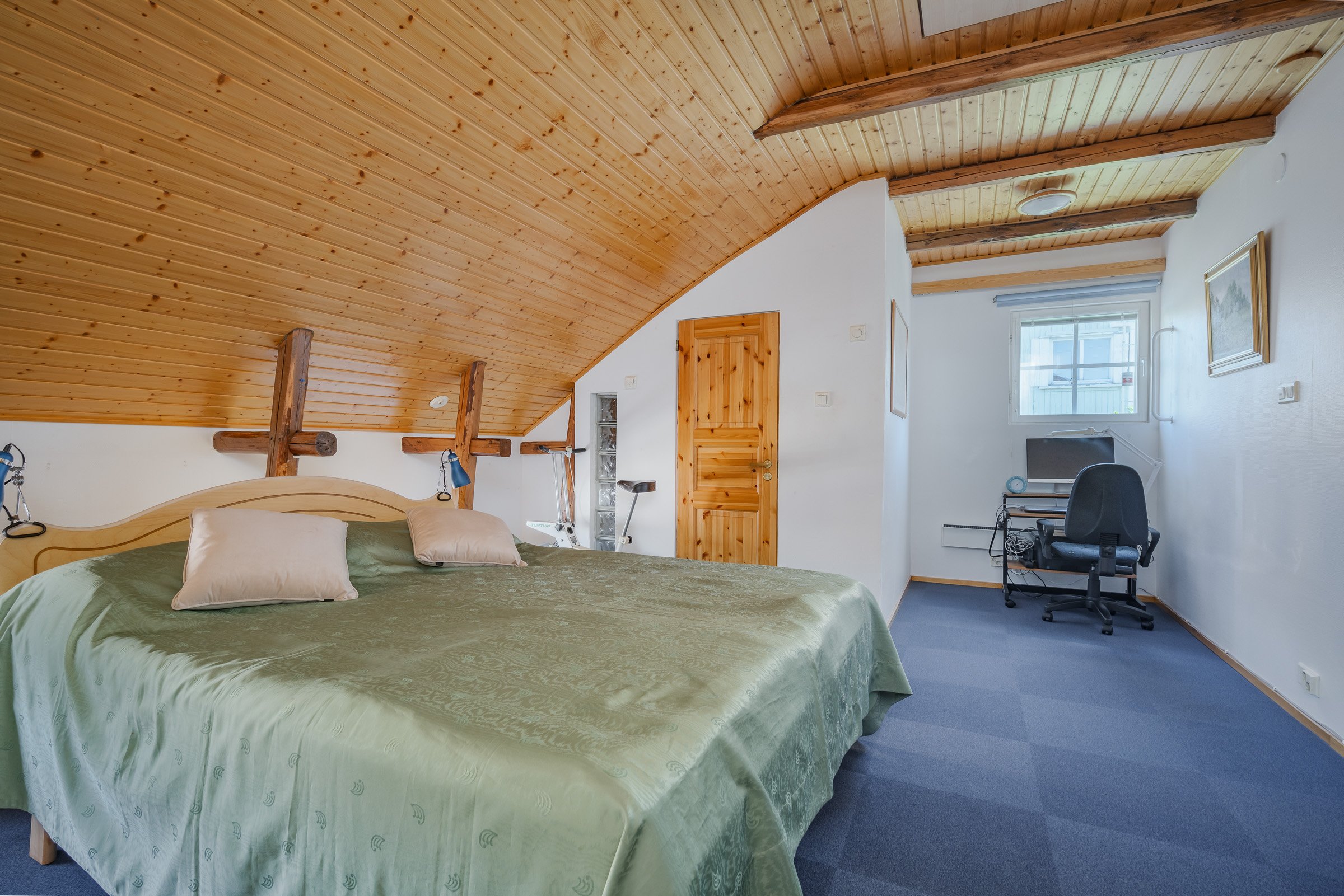 Tässä kodissa yhdistyvät avaruus ja kodikkuus: korkeat huoneet ja suuret ikkunat tekevät tiloista valoisat, ja päätyasunnon rauha tekee arjesta miellyttävän. Yläkerrassa sijaitsee erittäin tilava makuuhuone, jota voi halutessaan jakaa kahdeksi erilliseksi tilaksi. Kattohirret tuovat kotiin ripauksen vanhan ajan charmia, ja reilun kokoinen kylpyhuone poreammeineen tarjoaa arkeen ripauksen luksusta.