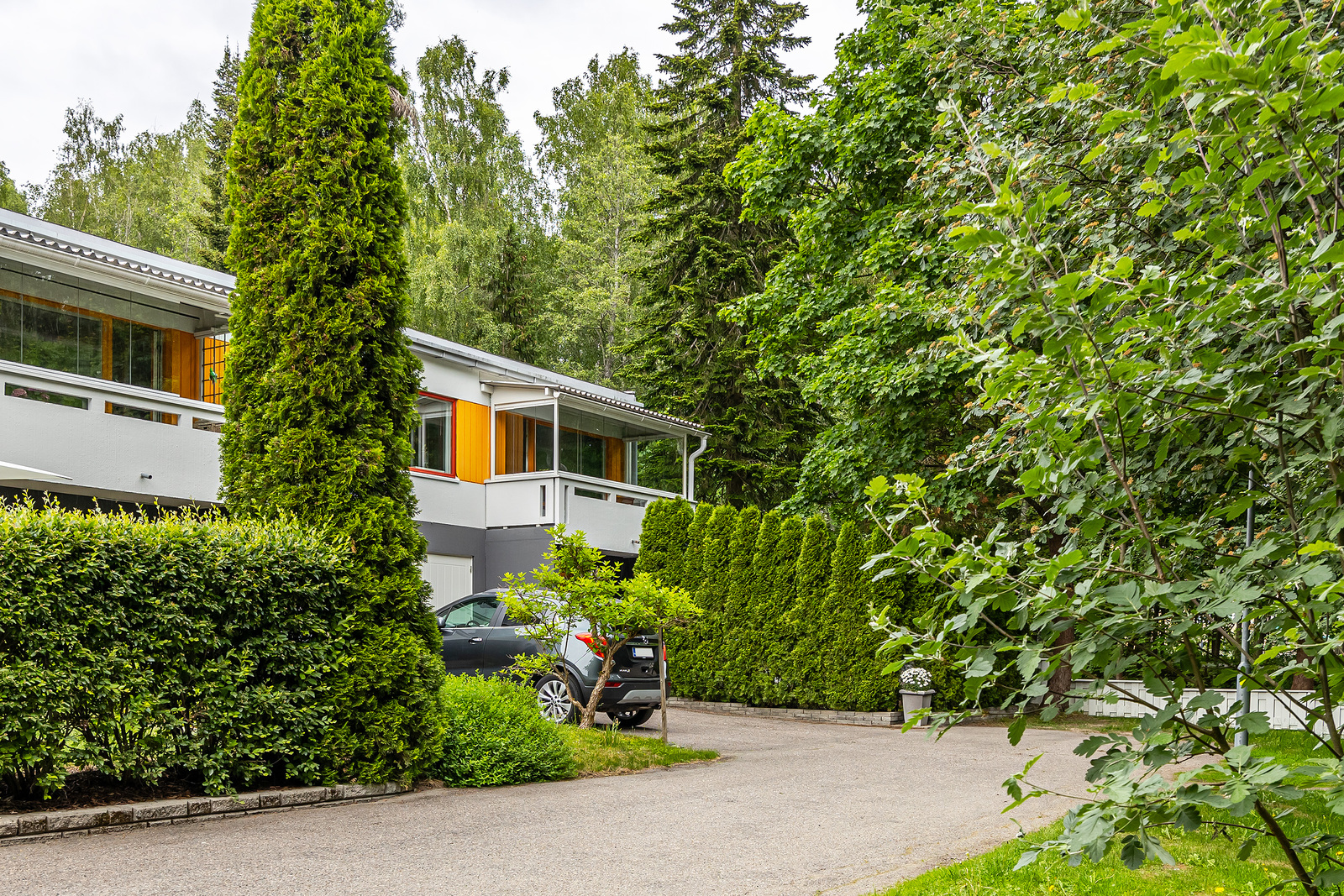Kahdessa kerroksessa olevan kodin sisääntulokerroksessa makuuhuoneen lisäksi on vaatehuone, erillinen wc, askarteluhuone, tilava pesuhuone sekä sauna. Alkuperäinen, tyylikäs tammipuuportaikko johdattaa avaraan olohuoneeseen. Tämän lisäksi yläkerrassa on erillinen keittiö, kaksi hyvän kokoista makuuhuonetta, wc, kylmiö (ei kylmiökäytössä) ja varasto. Olohuoneesta on käynti lasitetulle parvekkeelle, jossa voit nauttia vehreästä metsänäkymästä. Ulkona, sisäänkäynnin yhteydessä on terassi sekä suojaisa, pieni nurmipiha. Aina tarpeellista säilytystilaa on reilusti. Kaapistojen, vaatehuoneen ja varaston lisäksi portaikon alla on lisätilaa. Huoneistoon kuuluu myös lämmin autotalli.