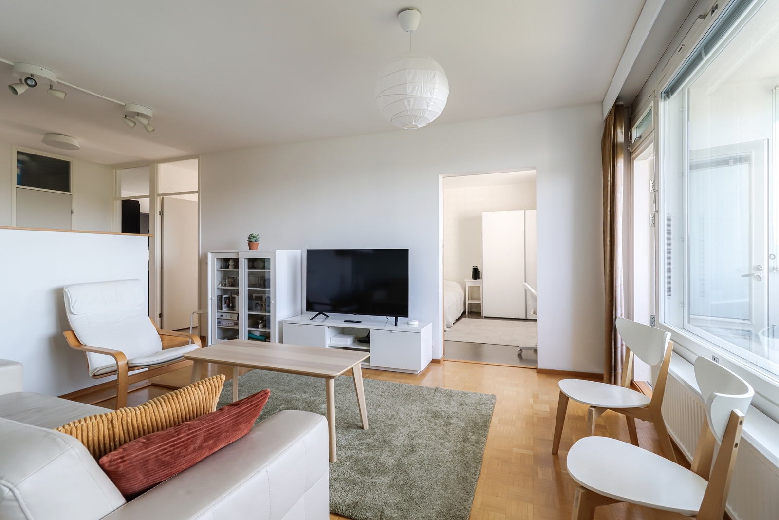 Kahdeksannen kerroksen valoisa päätyhuoneisto, josta avarat, vehreät näkymät. Tähän kotiin mahtuu isompikin perhe (4 makuuhuonetta, avara olohuone, keittiö, sauna ja sen pesuhuone, vaatehuone ja kaapistot, lasitettu länsiparveke, wc ja kylpyhuone, jossa myös wc-istuin.