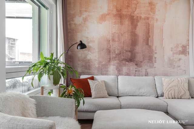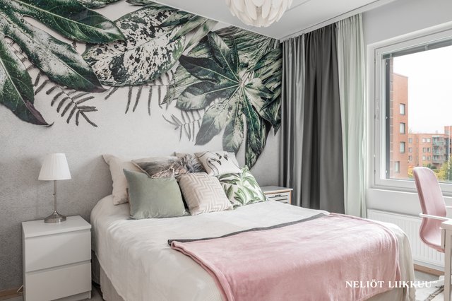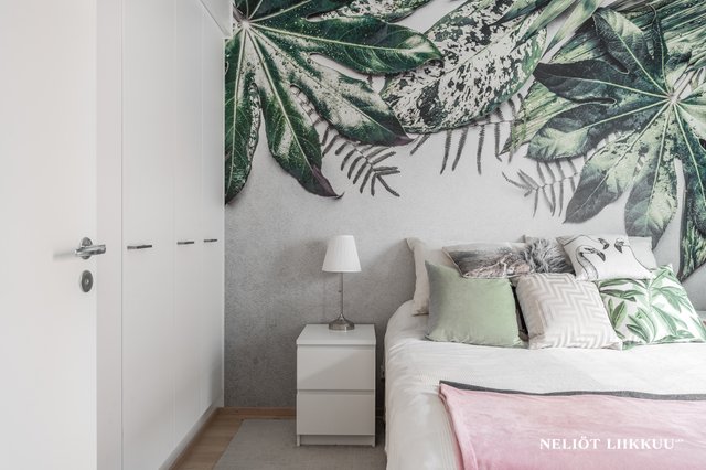 - Olo- ja makuuhuoneessa kauniit tapetit.
