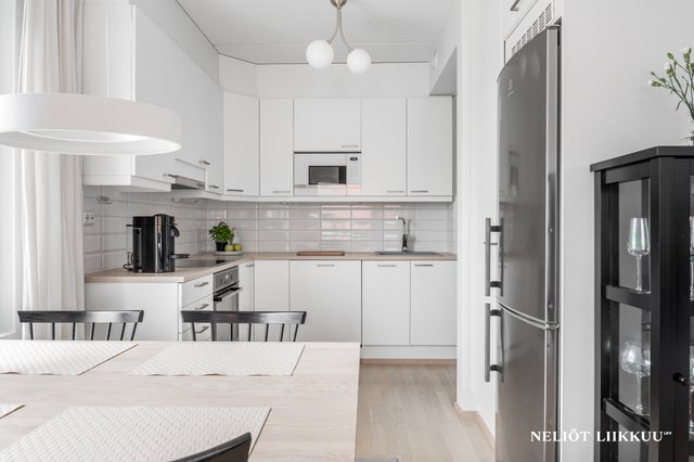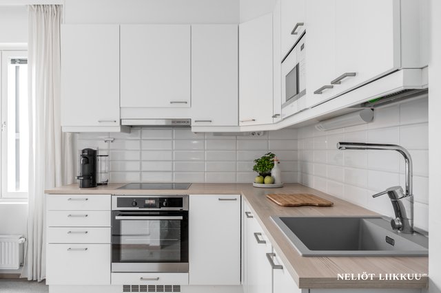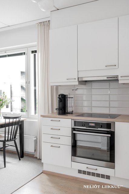 - Valoisa keittiö, jossa hyvin kaappitilaa.