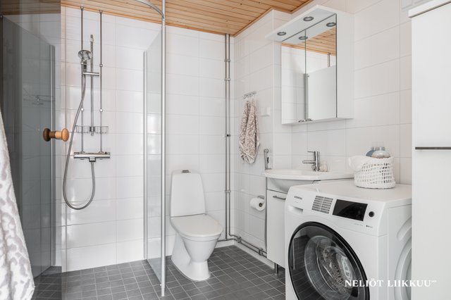 - WC-istuin, suihku, suihkuseinä, pesukoneliitäntä, lattialämmitys, peilikaappi, allaskaappi, ja bidee-suihku