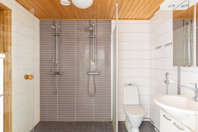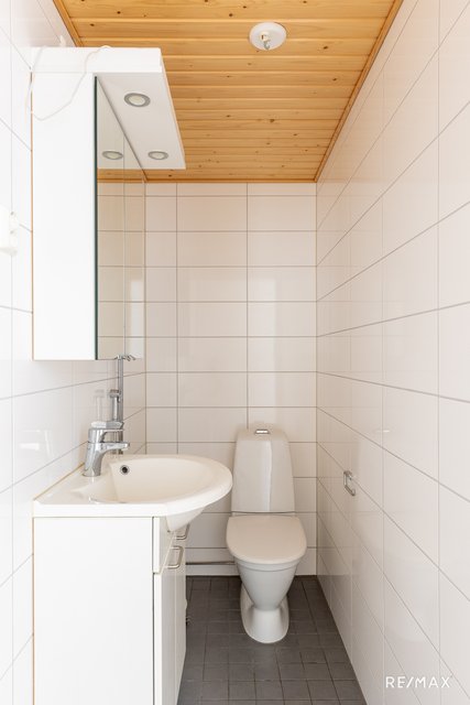 - WC-istuin, suihku, suihkuseinä, pesukoneliitäntä, lattialämmitys, peilikaappi, pesuallas, ja allaskaappi