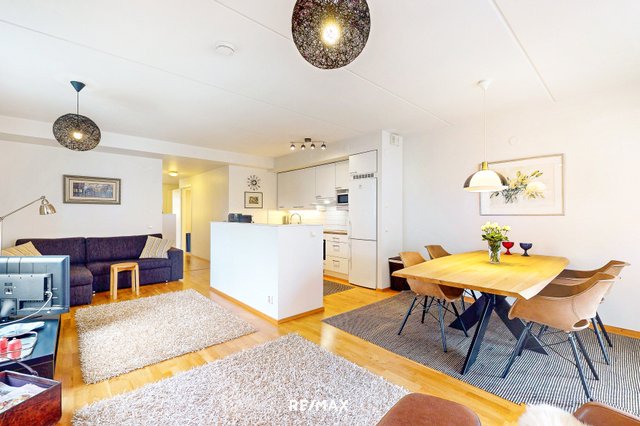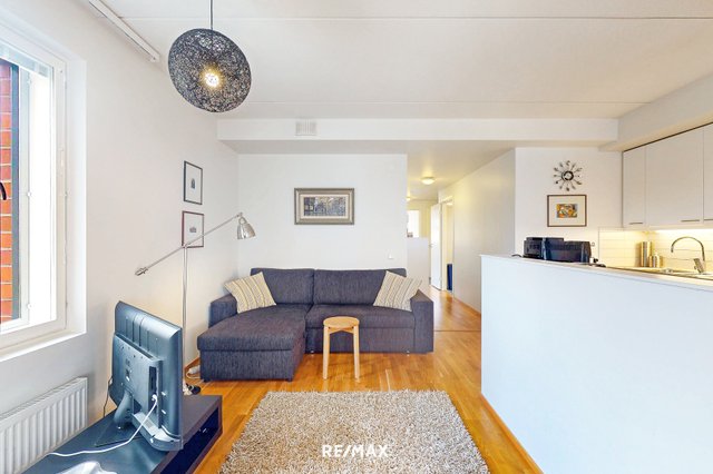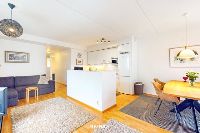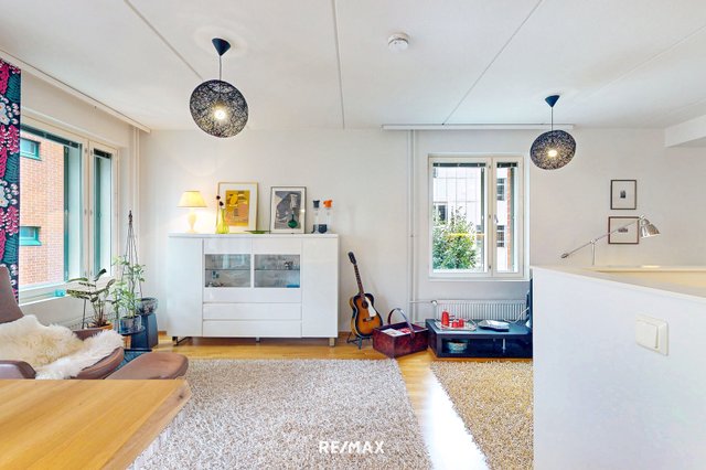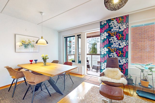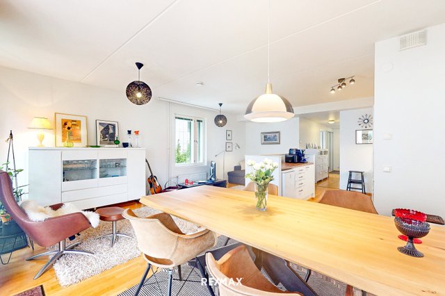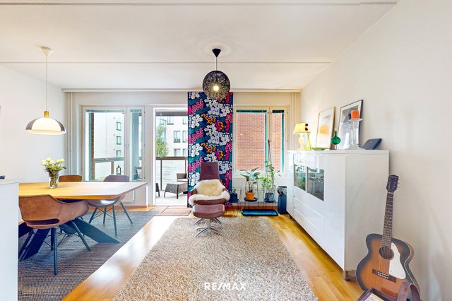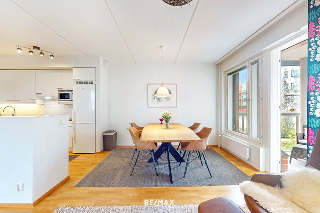 - Valoisa ja avara olohuone yhdistyy sujuvasti keittiöön. Maalatut seinät ja tammiparketti luovat lämpimän ja tyylikkään ilmeen. Olohuoneesta on käynti lasitetulle parvekkeelle, joka toimii viihtyisänä jatkeena oleskelutilalle ja tuo runsaasti luonnonvaloa sisään.