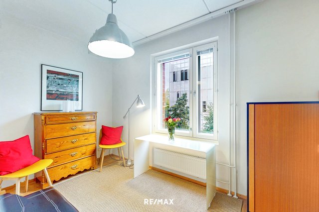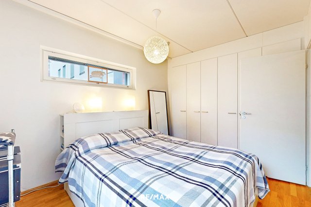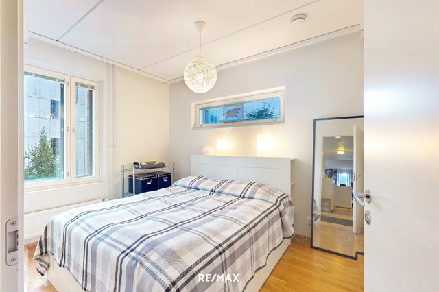 - Asunnossa on kaksi makuuhuonetta – tilava päämakuuhuone sekä pienempi makuuhuone. Molemmissa huoneissa on kaapistot, jotka tarjoavat käytännöllistä säilytystilaa. Maalatut seinät ja yhtenäinen tammiparketti tuovat huoneisiin harmonista ilmettä ja kodikasta tunnelmaa.