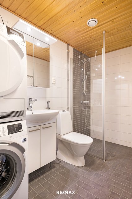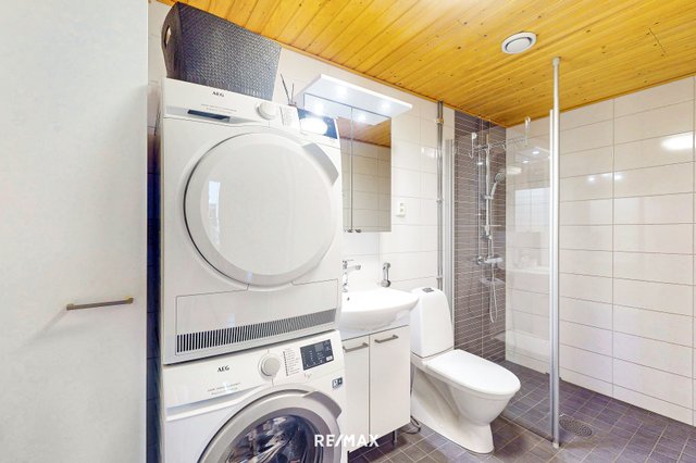 - Kylpyhuoneessa yhdistyvät selkeälinjainen design ja käytännölliset ratkaisut. Tilasta löytyy wc-istuin, suihku, suihkuseinä, lavuaari, allas- ja peilikaappi sekä bideesuihku. Pesukonevalmius ja pyykkikaappi mahdollistavat pyykkihuollon kätevästi omassa kodissa. Harmaa laattalattia sekä valkoiset seinäpinnat luovat raikkaan kontrastin. Miellyttävä lattialämmitys tuo lisämukavuutta viileisiin aamuihin.